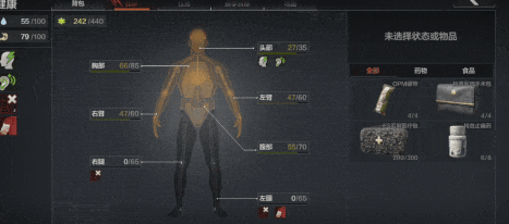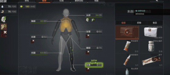 当口袋和弹挂中有医疗物资时我们可以快捷使用,但这样无法指定部位优先治疗,如果遇到医疗物资有限,身体又多处损坏的情况,可以打开背包后切换到健康页面针对各个部位进行治疗,比如先治疗腿部损坏,恢复移动能力。