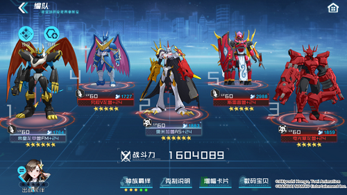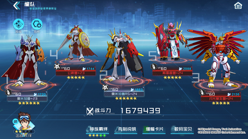 2、编队特色:斯雷普兽的群体加速配合奥米加兽AS的群体过载,可以将速度较慢的输出角色提至先手,使帝皇龙甲兽FM与电光暴龙兽一波击败敌方的大多数阵容,究极V龙兽作为强力的单体攻击角色,可以补充队伍的单点伤害,佩带能量插件后,可以依靠其多次行动的特性为队伍提供进化能量。