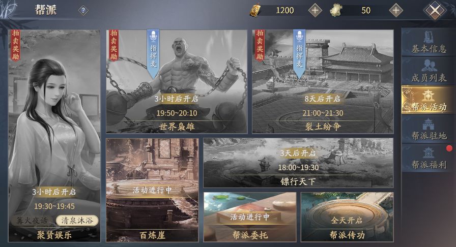 裂土纷争活动在周日20:30-21:00开启,玩家需要在60级及以上可以参与活动。活动从【帮派-帮派活动】面板“裂土纷争”活动图标进入。