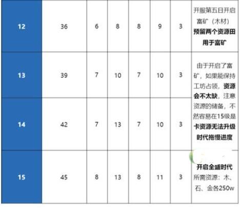 ③城镇中心5级:建筑升级开始使用石矿,但因为前期的资源田更替较快、产量低,所以石矿不建议提前储备。