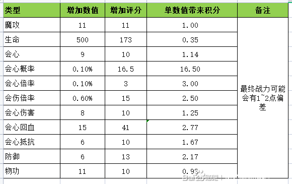 经过个人研究,宝宝的武器升级,每个属性的涨幅带来的评分是基本固定的,大概如下图: