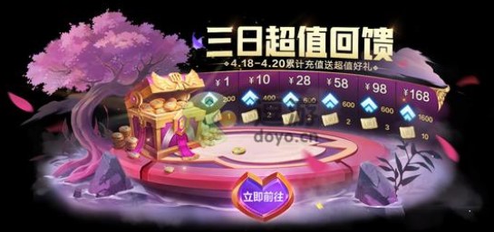 2.三日充值超值回馈,累计充值送好礼!4月18日—4月20日,参与三日充值【超值回馈】活动!累计充值可获得宝典经验、翎羽折扣劵!