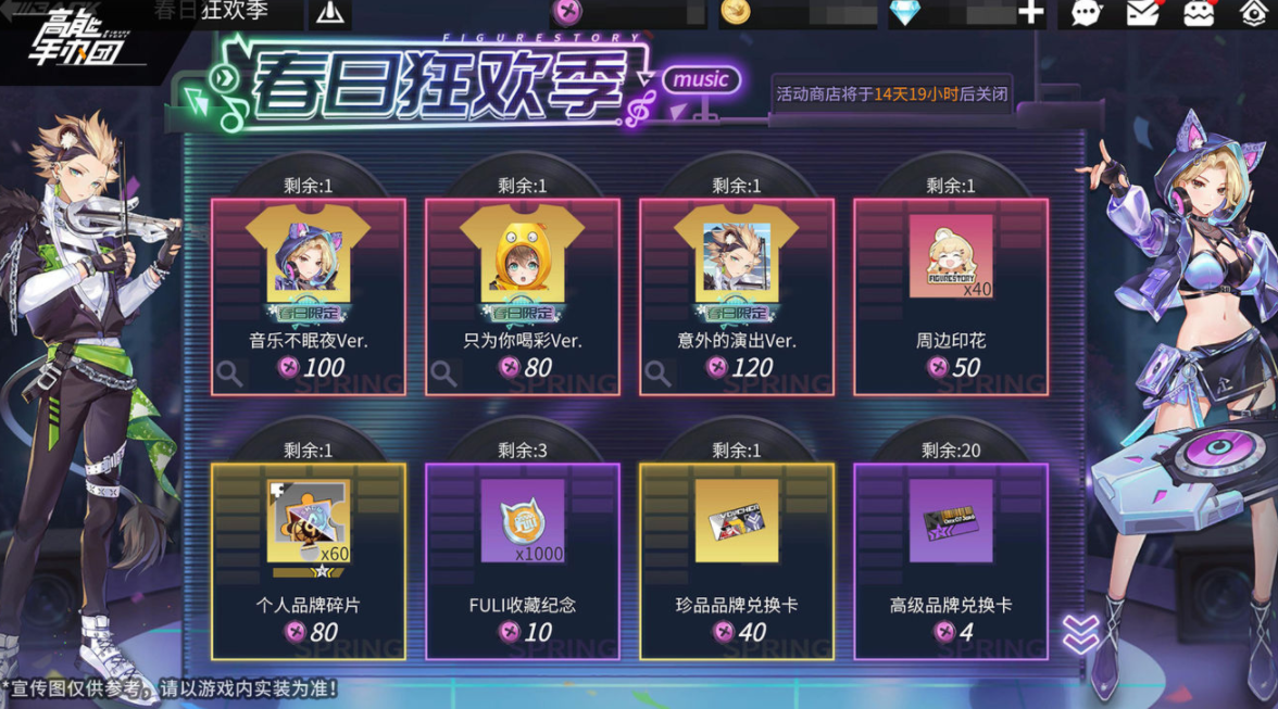 特别商店“春日狂欢季”开放,使用特殊道具“蛙蛙纽扣”可兑换珍贵道具,以及森林音乐节限定特别款——“梅根·音乐不眠夜Ver.”、“卡缪·意外的演出Ver.”、“绿子·只为你喝彩Ver.”,限定主题装扮期待点亮后宅。