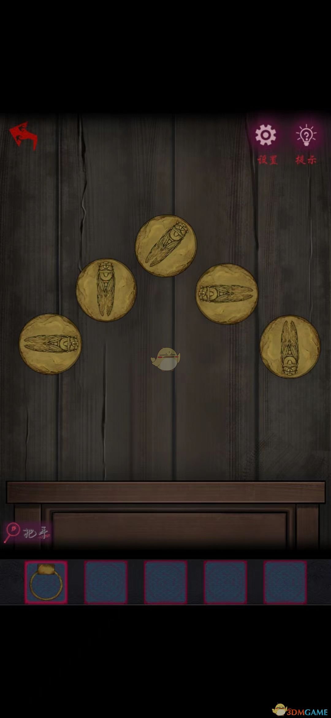 将【蝉摆件】放入墙上的机关,根据线索调整方向:右、上、右上、左、下。打开暗门