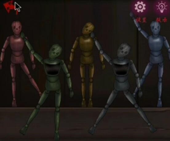 绿色人偶要摆出黄、蓝人偶的姿势组合,黑色人偶要摆出红、黄、蓝人偶的姿势组合。