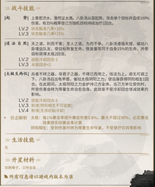 作为大师兄的八卦汤身着一裝黑白道袍,气质沉稳老成,其毛绒披肩上用水墨染出太极图案,更给他增添了几分高深玄妙。他虽模样年轻,但因说话做事不急不躁,竞意外地让人觉得可以托付。就这样,八卦汤凭借着“天下第一天师”的名头,开始了重振非我道的长路。