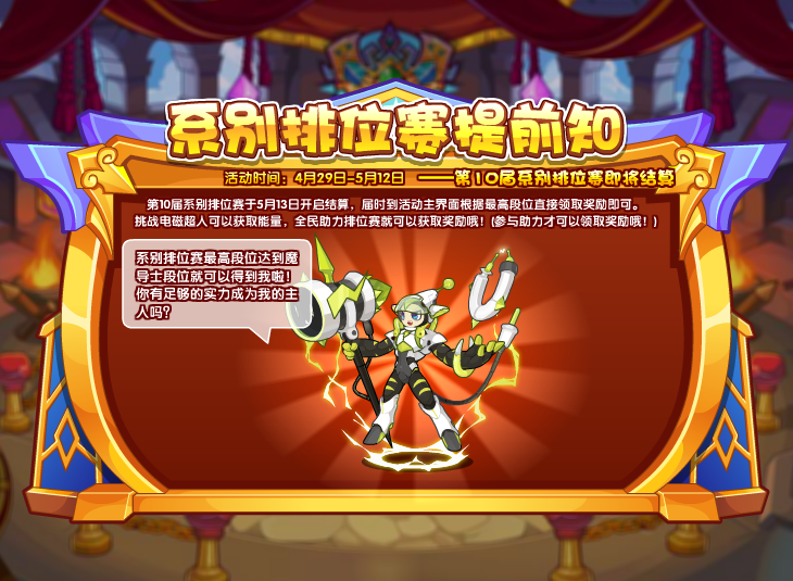 第10届系别排位赛于5月13日开启结算,届时到活动主界面根据最高段位直接领取奖励即可。