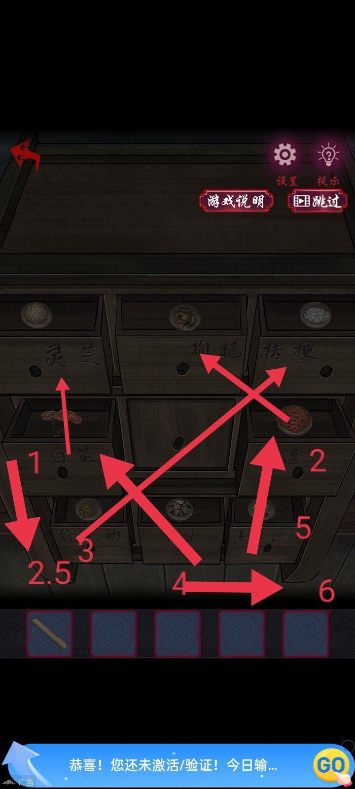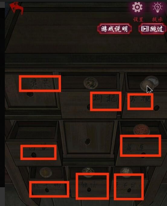 用发钗打开药神殿门后,点击旁边的药柜,把药材拖到对应药柜里面,药柜上面都标明了药材名字,注意看药柜下面有个捣药钵,是等会要捣碎雄黄用的;