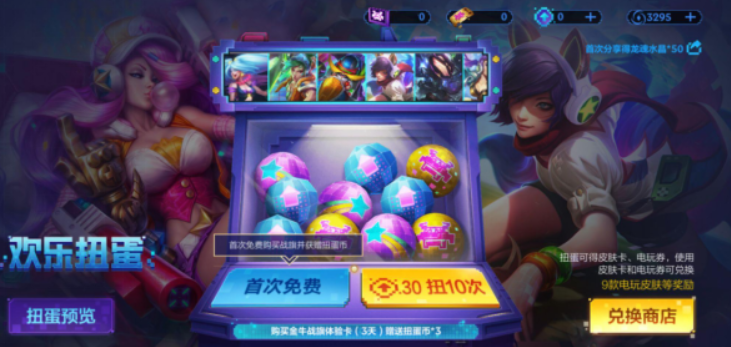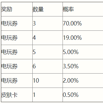 2.每使用3个扭蛋币可以进行扭蛋1次,每次扭蛋可随时获得3~10张电玩券或者1个皮肤卡。如通过扭蛋获得了皮肤卡,可激活好运分享,活动期间首次分享好运可以额外获得3个扭蛋币。