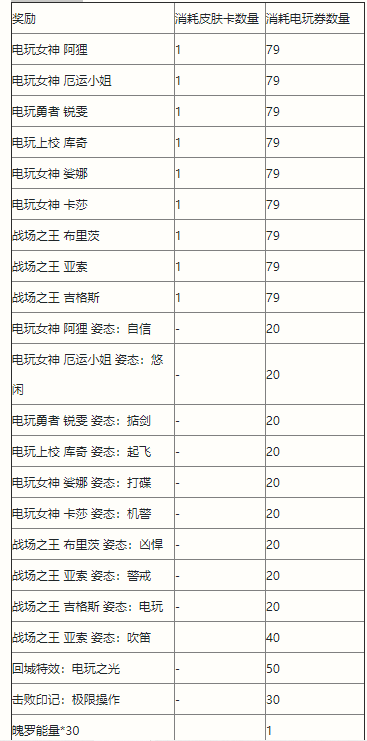 3.1张皮肤卡可兑换1款电玩系列的皮肤,一定数量的电玩券可兑换电玩系列皮肤、姿态等奖励。