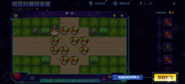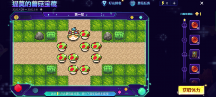 5、 蘑菇地图总共分为5层,每一层有1个随机蘑菇为通往下一层的入口,点击蘑菇找到入口后,再次点击入口,即可通往下一层,越往下层奖励越丰富;