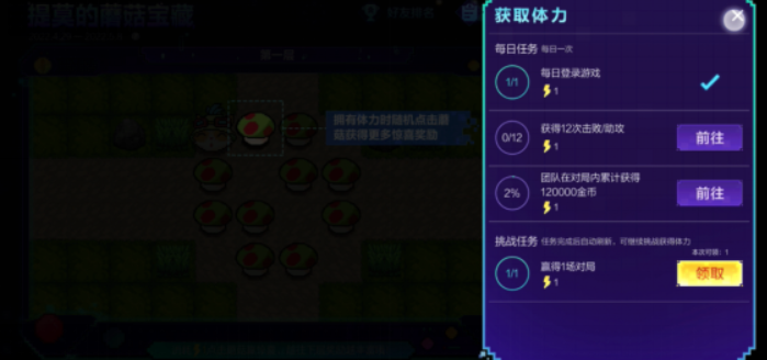 1、 点击“获取体力”完成活动每日任务和挑战任务,可获取活动体力,体力仅在本活动可使用;