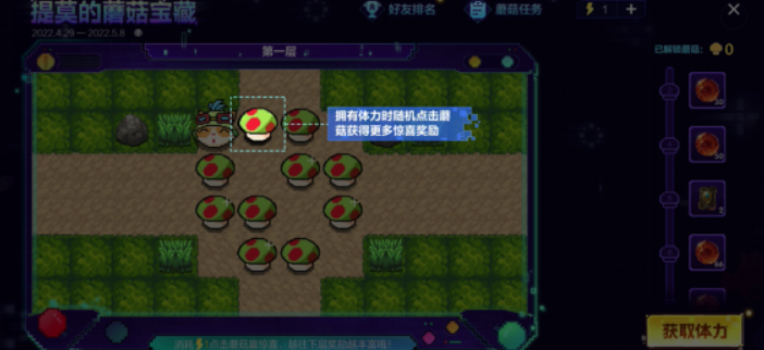 和提莫一起寻找蘑菇宝藏吧!在活动期间内,完成任务即可获得体力,消耗体力点击蘑菇,可解锁随机任务,奖励等。解锁蘑菇达到一定数量,即可领取对应蘑菇里程碑奖励。