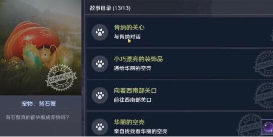 3、然后我们回到宠物界面,点击背石蟹找到与肯纳对话的任务。