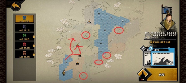 1.集齐五个士大夫点治策郡县制。点出郡县制(需要五个人才),就可以用户籍(需要三个士大夫)爆兵了。再也不用买兵了。