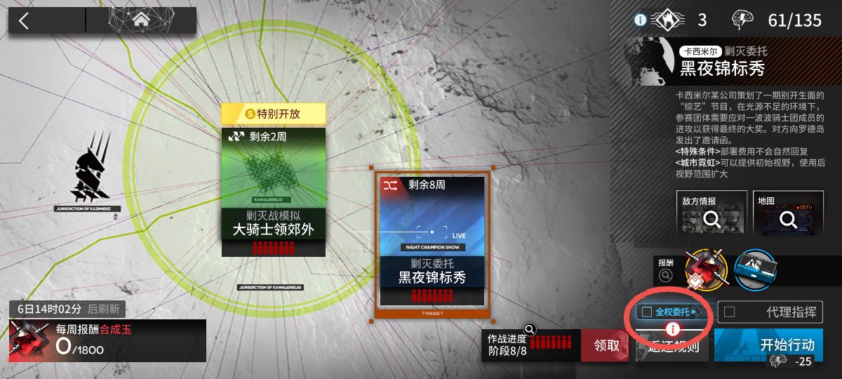 1、小伙伴们可以直接来到剿灭界面,在手动通关一次之后,就能看到“全权委托”(如下图)可以使用了: