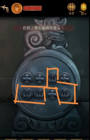 3、里屋的门机关有点眼熟,退到大门口,旁边的石兽有线索,跟门上的图案一致。下下上下。进卧室。