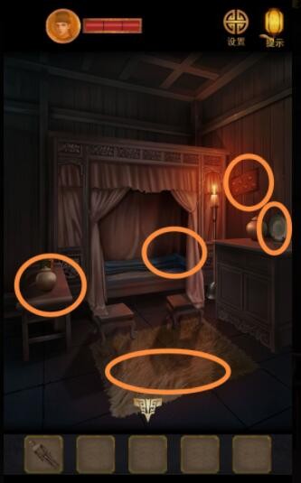 4、左边桌上陶俑旁边拿蜡烛,右边桌子上拿剪刀,上床枕头缝捡窗花,然后拿剪刀划破枕头,获得铜碎片。