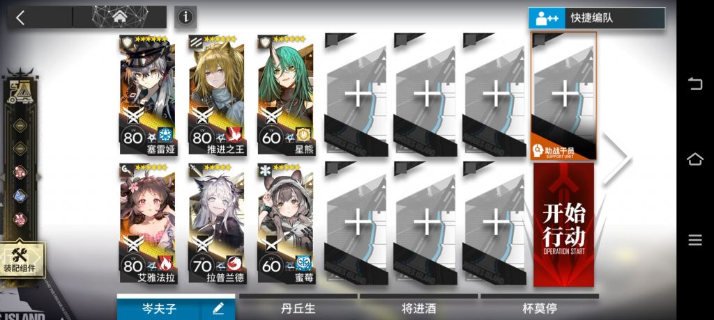 核心是星熊反甲,没有的话要多带点单切,推荐多带个重装干员补位推王