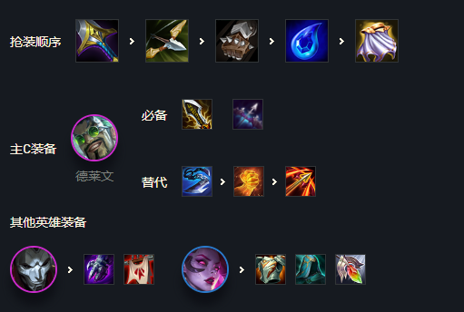 主C德莱文:装备给上无尽,轻语,巨杀备选正义,分裂。