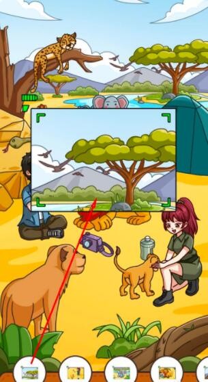3、向上滑动帐篷大门的拉链。拖拽帐篷里的紫色梳子到左边树干上趴着的猎豹身上。将相机拖拽到猎豹身上。当相机屏幕显示猎豹画面时,点击相机屏幕即可获得第三件物品。