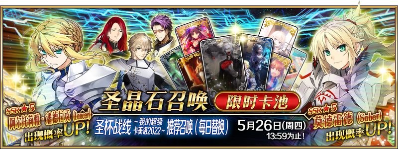 与限时活动「圣杯战线 ~我的超级卡美洛2022~」相关的从者中,包含通常只能在剧情卡池召唤的阿尔托莉雅·潘德拉贡(Lancer)、高文、崔斯坦的5骑从者将参与推荐召唤!