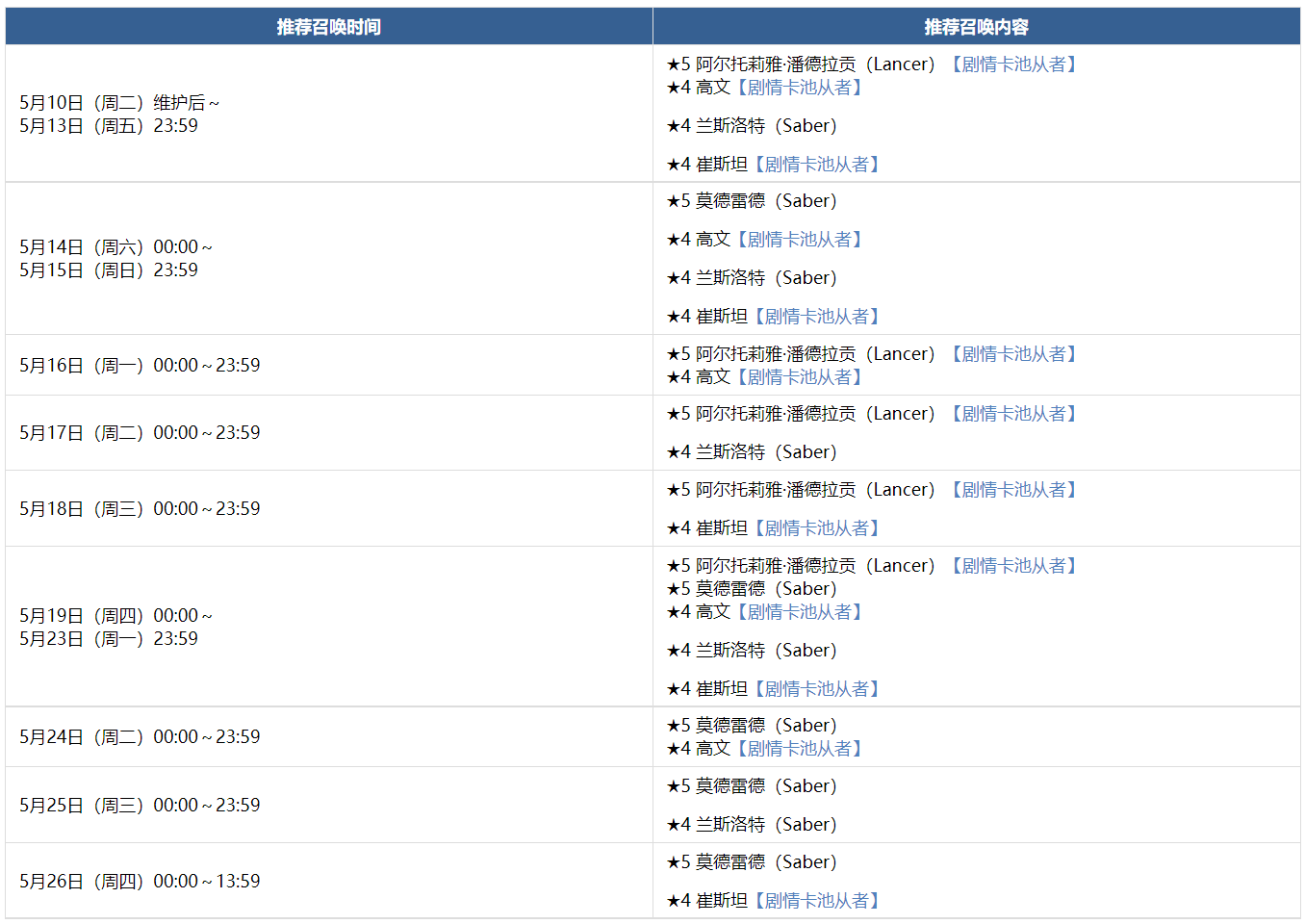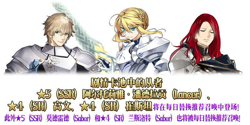※本卡池为每日替换卡池,所以并非每天都可召唤以下从者,敬请注意。