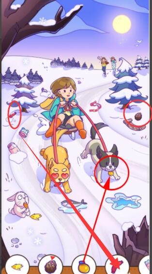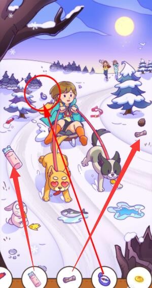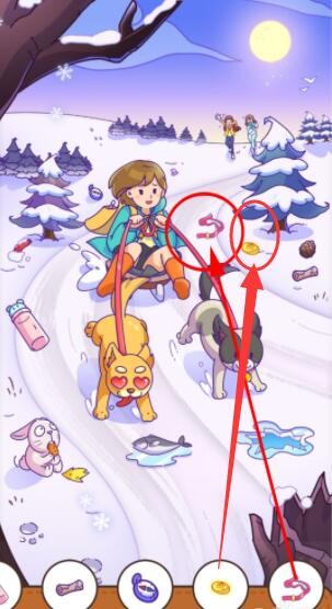 点击冰面3次后,狗狗停止奔跑,女孩的防风眼镜就会掉在雪地上。
