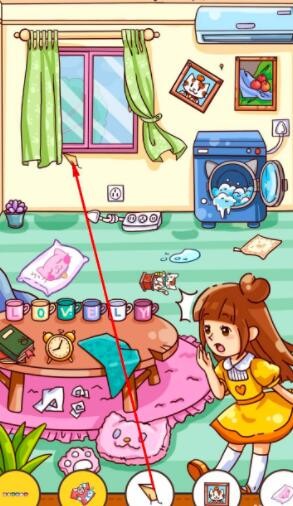 向左滑动散开的窗帘。窗帘扶正后,露出一个裂缝,点击即可获得第五件物品。
