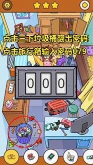 点击三下垃圾桶翻出密码纸条079,点击旅行箱输入密码079。