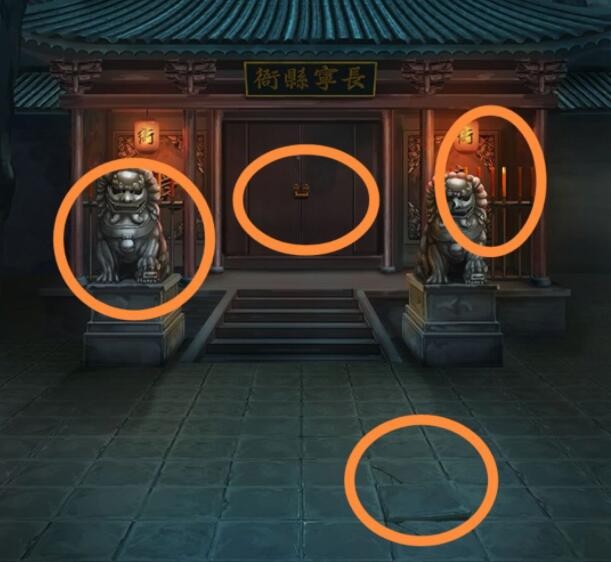 右边狮子后面拿个棍子,敲右下角地砖,获得石头眼球,安在左边狮子上,获得县衙大门钥匙