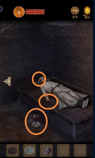拿钥匙开牢门,牢里躺着个中毒的人,他应该就是贼人急着进来灭口的人,得赶紧救他。首先把他手里的纸条薅走先。捡一下地上他吃剩的米糕。