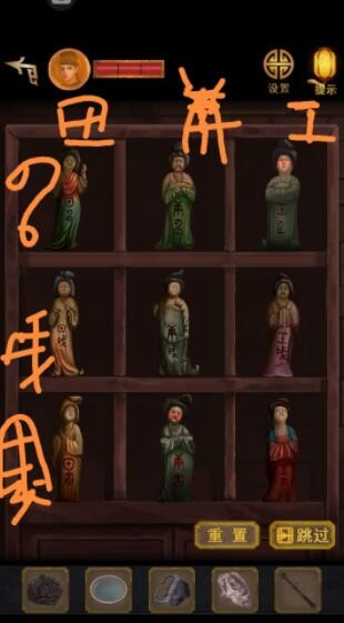 把陶俑放旁边柜子上,发现陶俑身上写了字,字好像跟刚才手上的纸条有点关系。按纸条拖动陶俑摆好。下面柜门打开,解药出柜咯。原来这容易有人误食断肠草,难怪家中常备健胃消bushi三黄药。