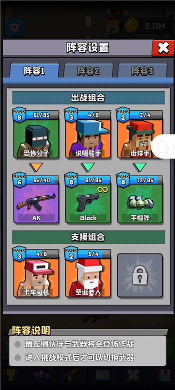 主武器ak,其余武器增伤需要而定。兑换码赠送ak和圣诞老人,三宝靠刷牌获取(圣诞老人建议梭哈2阶,点三天赋有宝箱打底)。前期没开支援位可以恐怖分子加圣诞老人加随意一个增伤进行挂机。