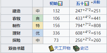 初始属性:建造132,农牧106,制作156,理财336,探险73