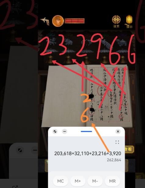 账本上红圈圈出来了六个数字,组合起来是二十三万两千九百六十六,把这个数字打在算盘上。获得铜钱。