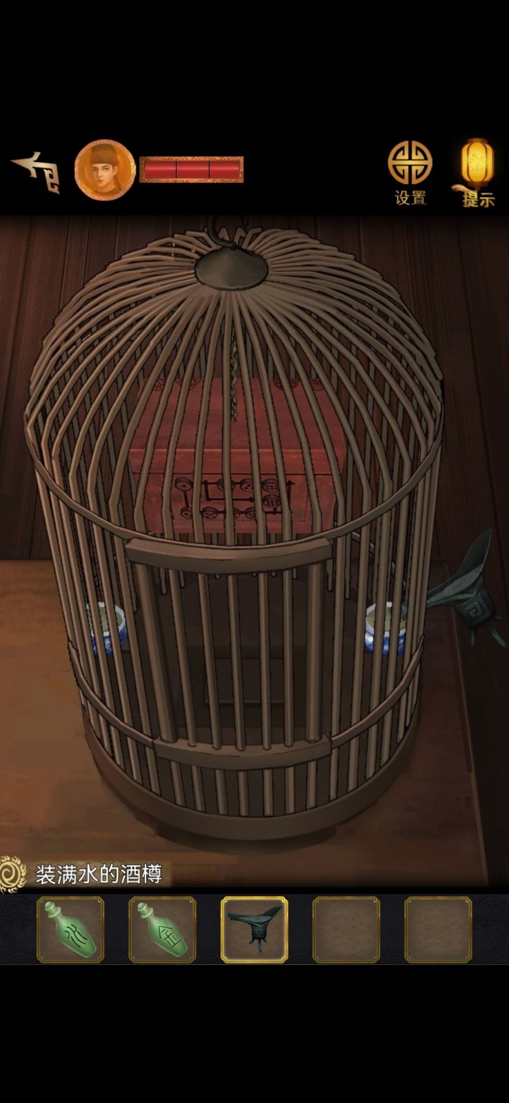 柜子旁边有个脸盆,拿酒樽在脸盆里装点水,倒在桌上鸟笼右边的水槽。获得木盒。