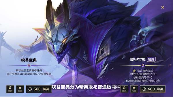 除免费奖励外,召唤师还可以选择购买峡谷宝典,解锁更多奖励!峡谷宝典分为普通版和精英版两种类型,购买精英版将直接提升5级宝典等级并且获得20%额外宝典经验加成,帮助召唤师更快速升级峡谷宝典~
