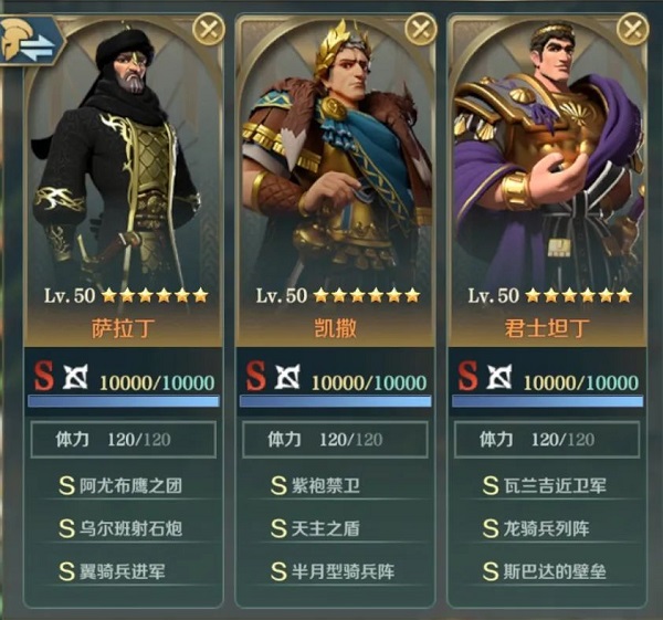 1、英雄选择:萨拉丁,君士坦丁,凯撒。(最优适配兵种属性为3S弓箭兵种)