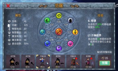 主动技能:子弹结界(身边围绕n秒圆形结界,结界内子弹可以多反弹n次)