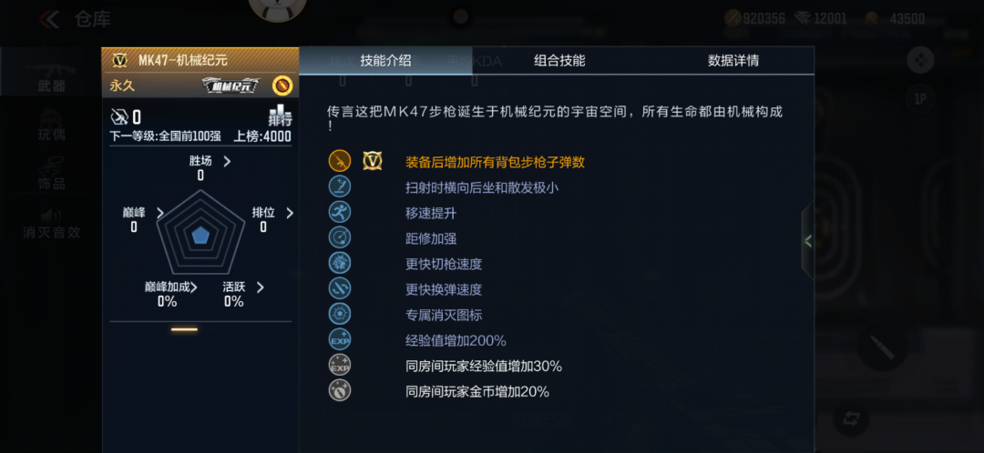 最重要的是,MK47-机械纪元还增强了移动速度、距修、切枪速度、换弹速度和精准度,且能与MK23-机械纪元、尼泊尔-机械纪元激活套装效果,获得2发主弹夹子弹加成。拥有这些强力技能属性的MK47-机械纪元可令你完美驰骋竞技模式!