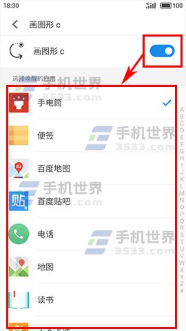 2)接着我们打开【手势唤醒】的开关,再选择一个要设置的快速唤醒手势,可以选择一个顺手的字母,点击打开后只要开启开关,再选择唤醒的应用,这样我们就能在熄屏状态下直接在屏幕上画一个图形,就可以唤醒应用了。(如下图)