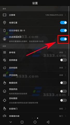 2)接着再按住取景区任意位置往左边滑动切换界面,进入相机设置界面后把【自动添加水印】的开关打开,这样拍照就会有徕卡水印了。(如下图)
