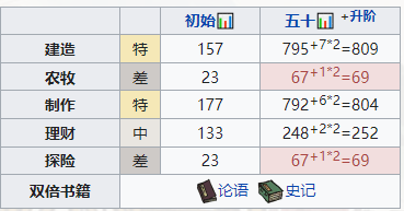 初始属性:建造157,农牧23,制作177,理财133,探险23。
