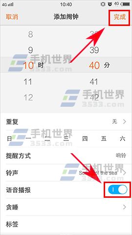 2)在设置好时间信息后把【语音播报】选项开启,再点击【完成】,这样当闹钟响起的时候也会播报当天的天气状况了。(如下图)