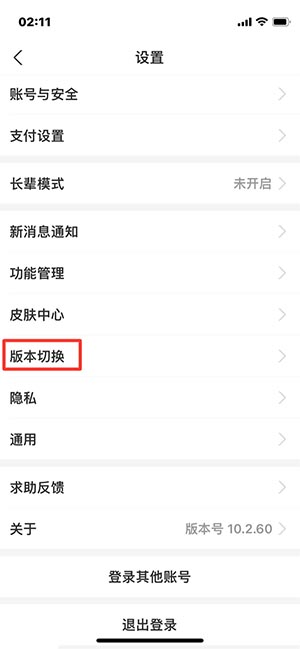 3、进入设置后,在皮肤中心的下方找到并点击【版本切换】,目前该功能仅限内测用户体验;