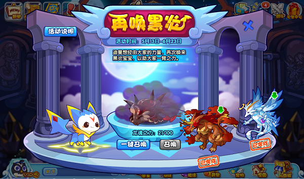 每天会有乐善天使、执着灵兽、梦想精灵、骁勇火焰其中两个随机出现,战胜它们就可以获得龙魂之力,不同难度的所给龙魂数量不同,当然是越难给的越多。