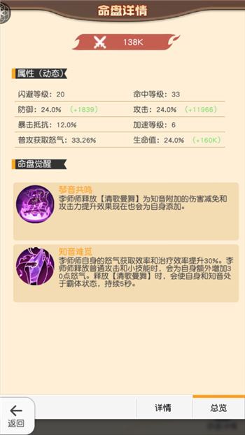 李师师自身的怒气获得效率和治疗效率提升30%。李师师释放普通攻击和小技能时,会为自身额外增加30点怒气。释放【清歌曼舞】时,会使自身和知音处于霸体状态,持续5秒。