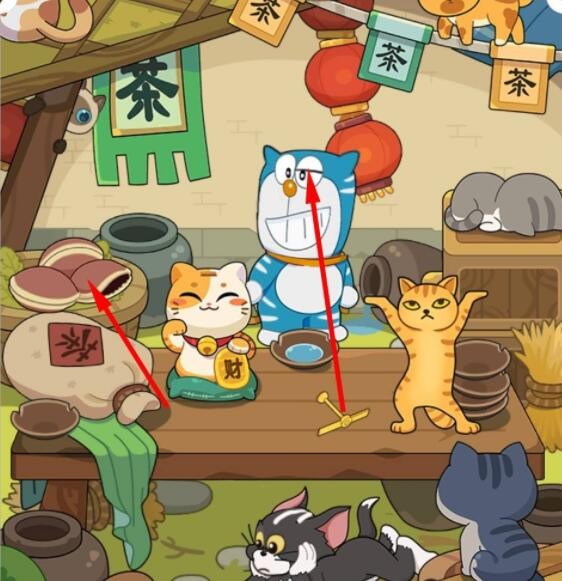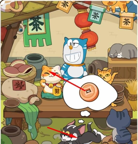 点击黑色汤姆后会浮现它正在想象的铜钱,将铜钱拖动到招财猫存钱罐里,招财猫会扔出一个竹蜻蜓,将竹蜻蜓带到哆啦A梦的头上后,点击旁边的铜锣烧,出来蓝色的杰瑞吓走哆啦A梦后,要找的小猫就在之前哆啦A梦身后的位置。