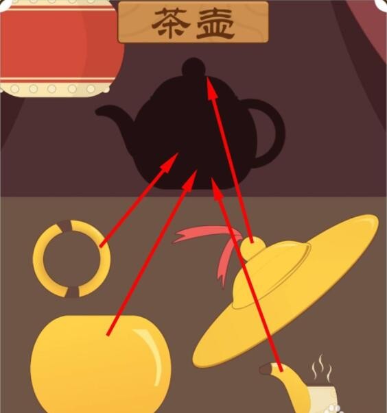 挪开红色的大鼓后,将壶嘴、壶身、壶把手、壶盖拖动到茶壶的阴影处复原茶壶。
